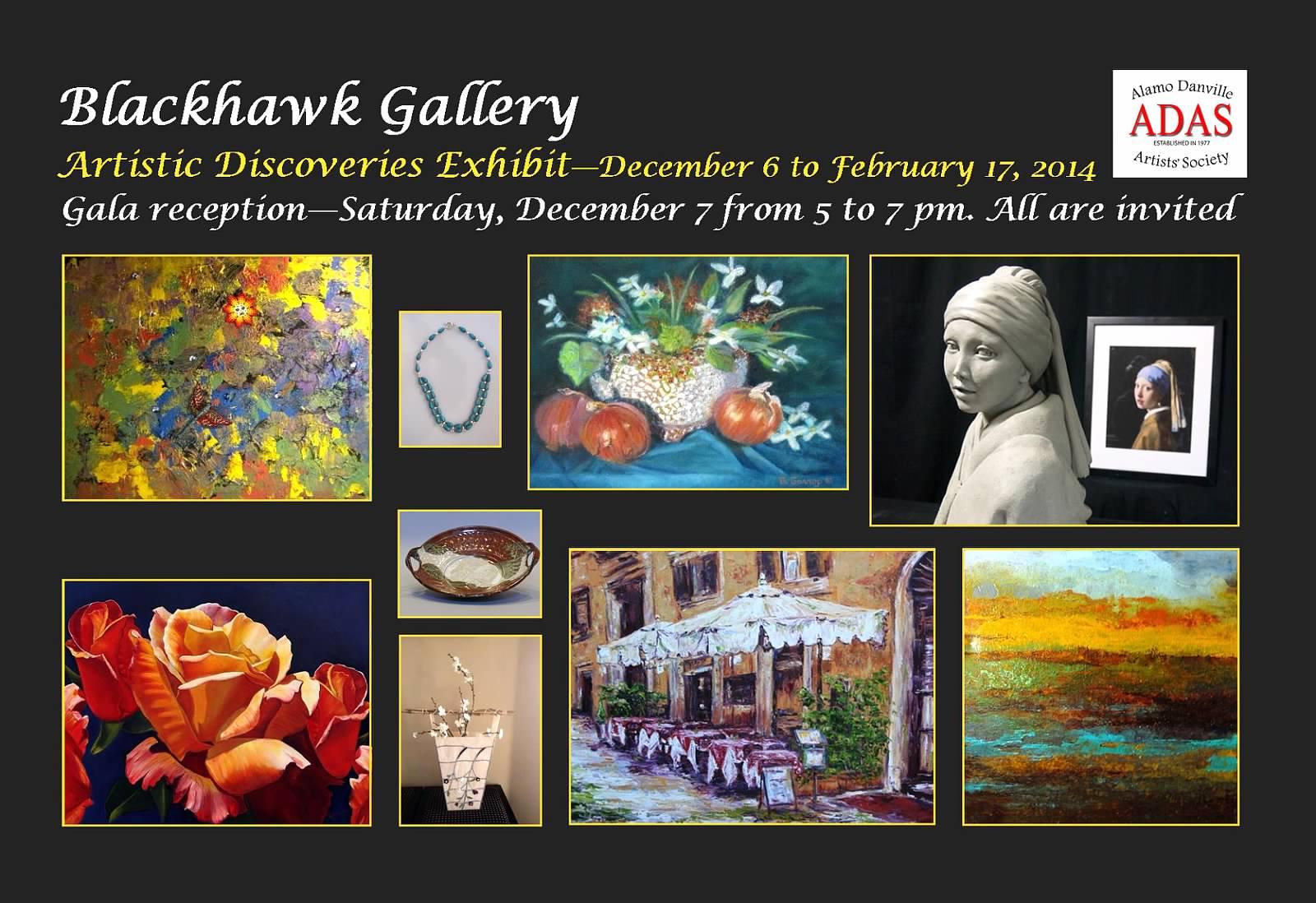 ADAS will host the opening of Artistic Discoveries featuring 48 artists exhibiting oil, acrylic, watercolor, pastel, photography, sculpture, ceramic, glass, wearable art, jewelry, and note cards. The exhibit is curated by ADAS Gallery Show Committee including Kerima Swain, Debby Koonce, and Pete DeFao.