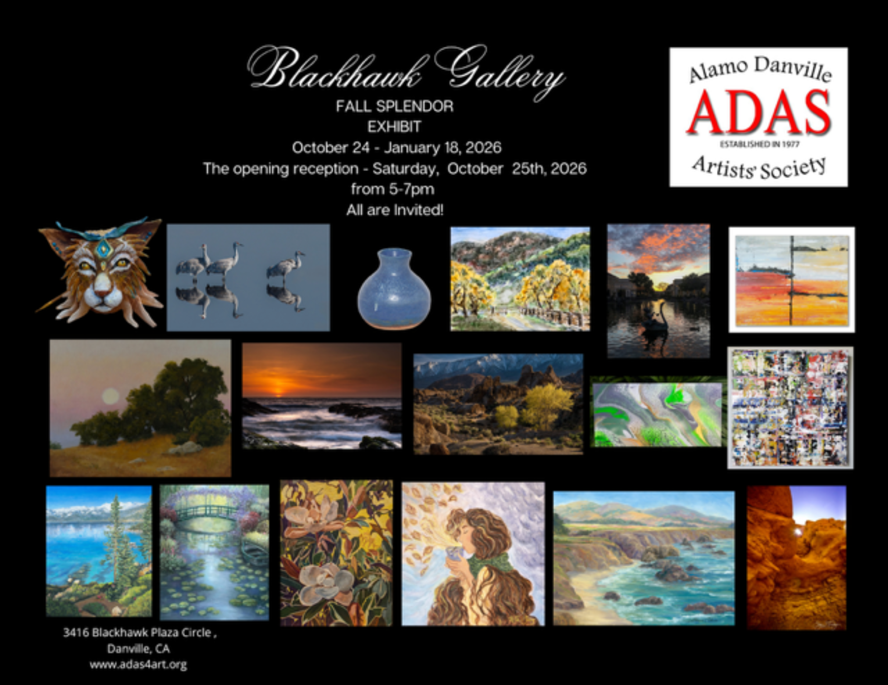 The Blackhawk Gallery is a nonprofit co-op art gallery, operated by the Alamo Danville Artists’ Society. The gallery features over 25 artists in consecutive 12-week exhibits. These established and emerging artists include members and guest artists from the San Francisco Bay Area. An eclectic collection of decorative and functional works on display and for sale include painting, drawing, photography, sculpture, ceramic art, wearable art, jewelry, prints, and note cards.