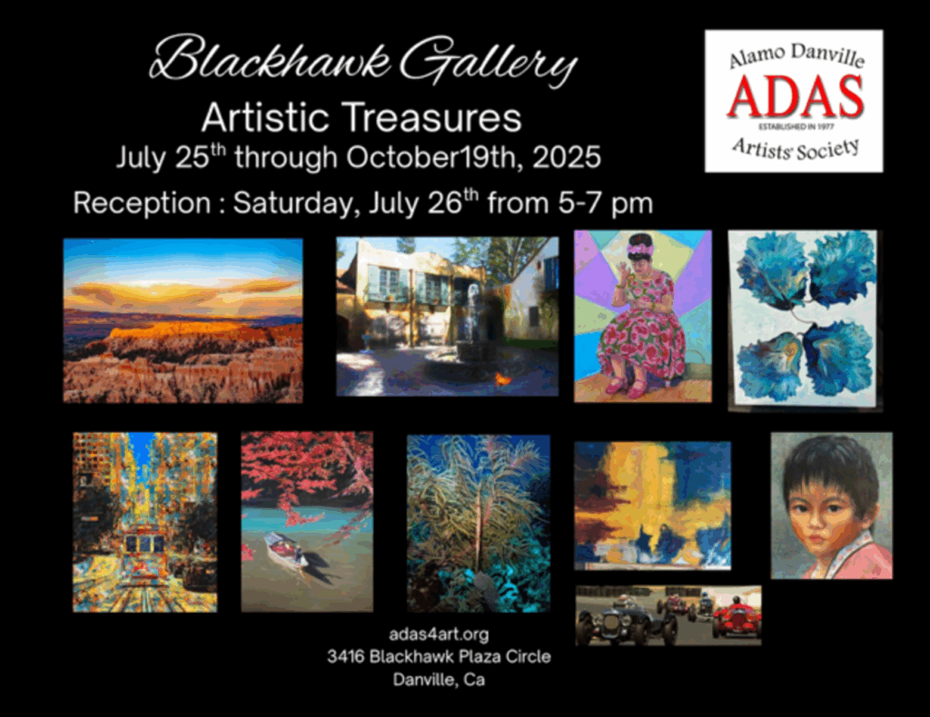 The Alamo Danville Artists’ Society will host the opening of Blackhawk Gallery’s new Exhibit, ‘Fall Splendor’. The exhibit will be open Wednesday through Sunday from Friday, October 24th 2025. The exhibit is free and open to the public.
