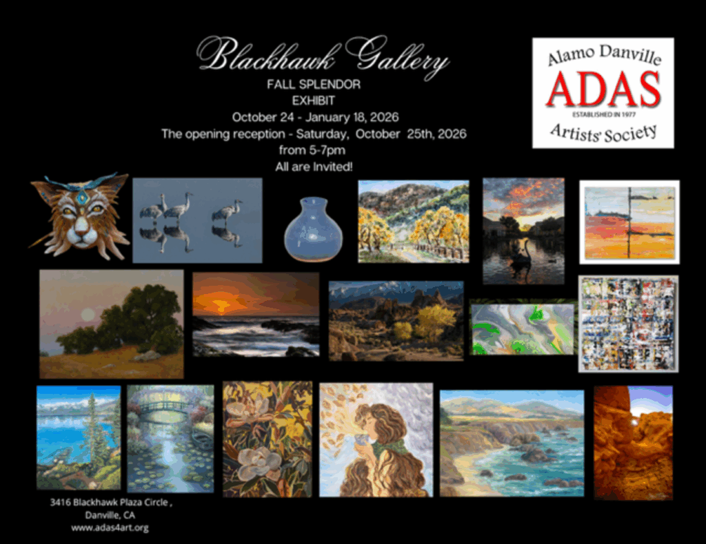 The Alamo Danville Artists’ Society will host the opening of Blackhawk Gallery’s new Exhibit, ‘Fall Splendor’. The exhibit will be open Wednesday through Sunday from Friday, October 24th, 2025, through January 18th, 2026. The exhibit is free and open to the public.