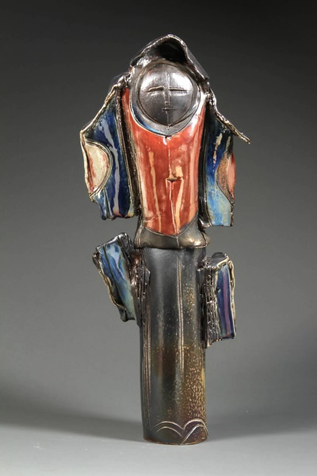 She finds that the forms like to relate to one another, as in a family. Her goal is to allow the invisible reality of a form to evoke a feeling, a sense of the spirit made visible. Guardians and sentinels have been a recurring theme since the 1980’s when she was at a time in her life when she needed a protective guardian spirit. Recent work has become more representational. She says, “ Clay is a transformative process. I feel a co-creator present with me as I create these forms. They come intuitively and from some deep universal space within.”