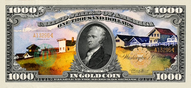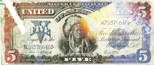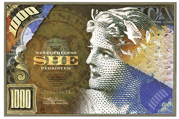 Don later began a series of abstract watercolor paintings as a response to a group of failed plein air studies. Painting freely with no intention or expectation, he thought of the work as creating a “color garden,” from which he harvested only the ripest areas. By digitally scanning small patches at high resolution, he greatly enlarged sections for printing. Using a photographer’s lupe to magnify detail and explore surfaces, he became fascinated by the intricate engravings on paper currency. This inspired him to combine elements of money with his watercolors to create original, limited-edition Giclée prints of women on currency. The women originally appeared on stock certificates. Don layered the imagery in Photoshop and digitally printed the pieces using archival inks and paper. The watercolor layer brought new life and color to the otherwise monochromatic currency. This series evolved into a range of multi-layered, money-inspired editions of original prints.